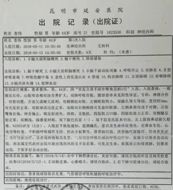 【典型案例1】龚医师采用自己独创的综合疗法,巧妙结合自制药物,成功帮助众多脑梗死患者重获健康。像44岁娄伟,在2018年5月因小脑大面积脑梗死,脑干梗死等多种严重病入院,病情极为严重。然而,在龚医师的精心治疗后,其身体状况得到了惊人的改善,几乎让人难以看出他曾是一名重症患者。