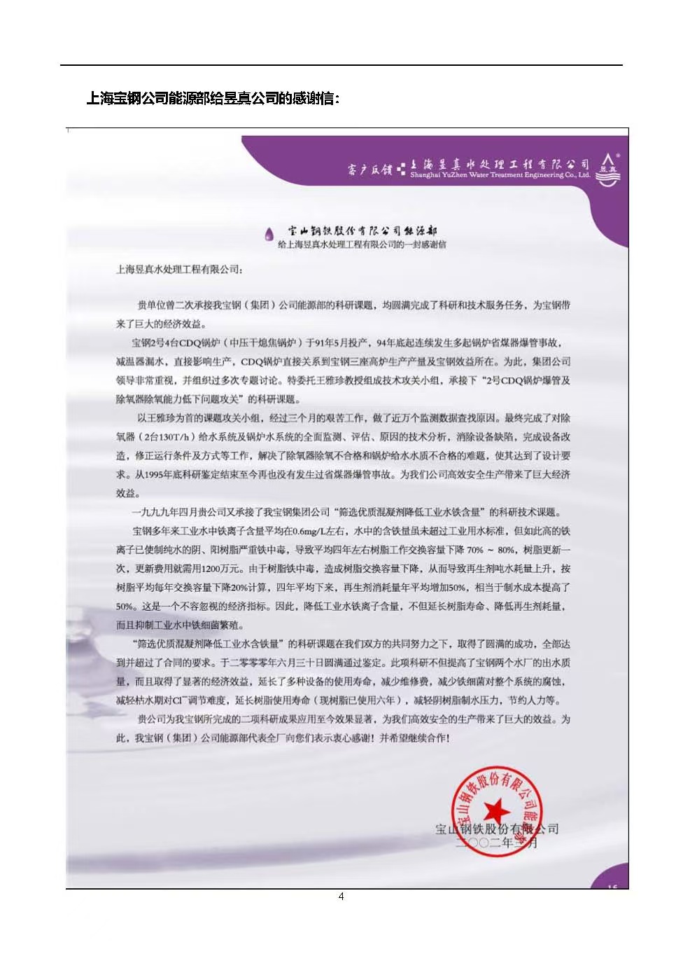 b、1994年我家从北京搬到了上海,1995年我为了在上海带学生搞毕业设计,我到宝钢找了一个科研课题,为上海宝钢解决了4台干熄焦发电锅炉除氧不合格等系列难题。为宝钢年直接增效7000万元,间接增效1.2个亿。1999年宝钢能源部门找我,让我给他们两个水厂 《筛选优质混凝剂、助凝剂降低工业水铁含量》。我承接了宝钢的科研课题。为宝钢创造了年直接经济效益4,000万元,间接增效7,000万元。可见二个公司给昱真公司写的感谢信。