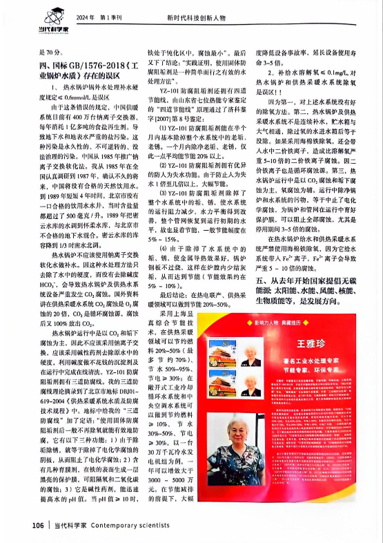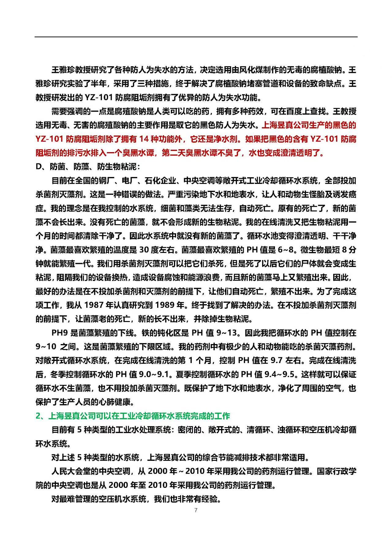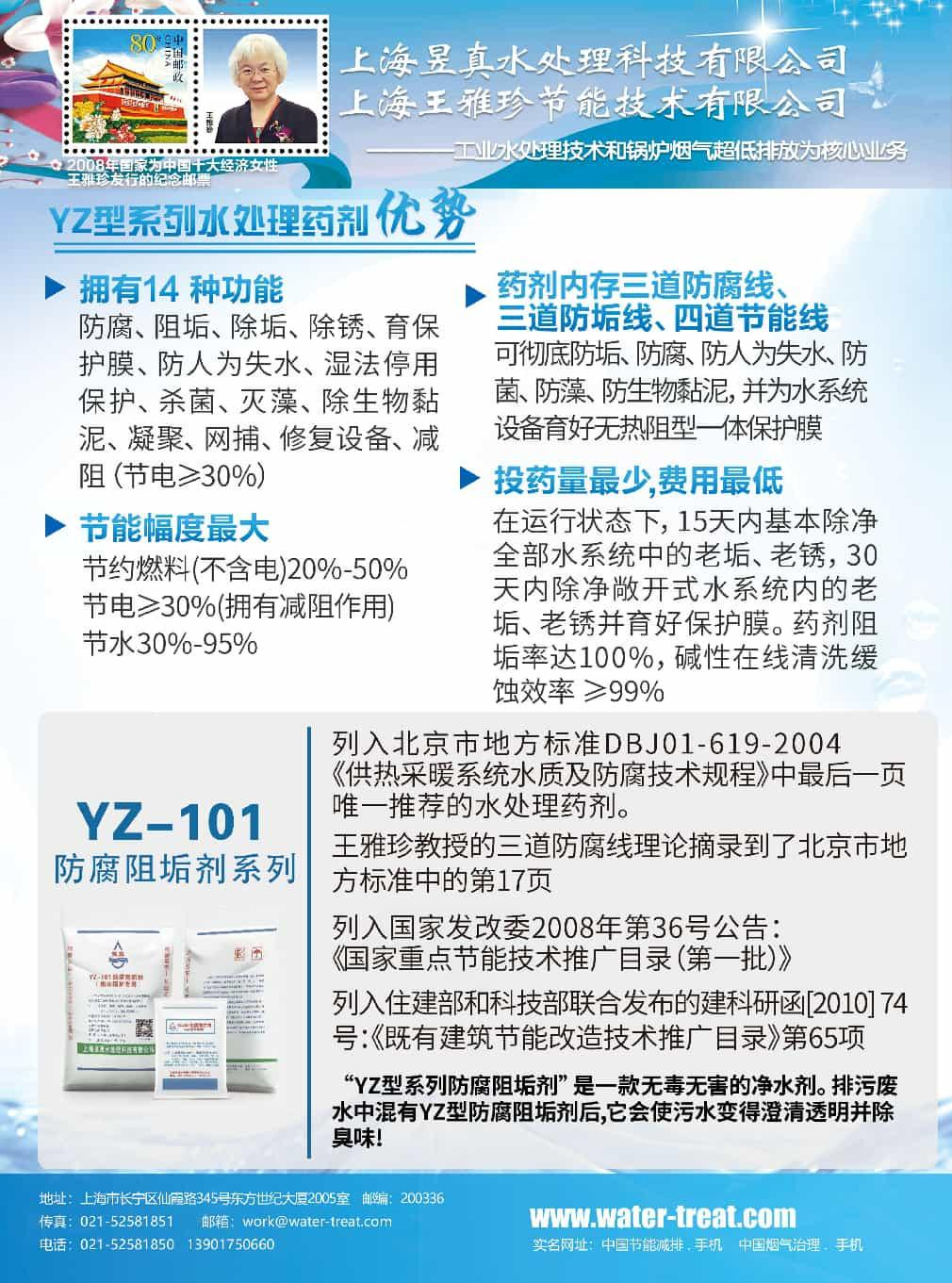 为了保护中国的水和天,我从1987年9月辞掉了教研室主任职务,全力以赴研究解决水污染的问题和烟气治理问题。我讲环保不但是保护环境,而且也必须是为企业节能减排增效! 我从1987年至1989年全力以赴,研发出了YZ型系列防腐阻垢剂。我是按《六防理念》研发的,即防垢、防腐、防失水、防菌、防藻、防生物粘泥的六防理念研发出系列药剂!我研发的药剂内含《三道防垢线》,《三道防腐线》和《四道节能线》,做到彻底六防,在运行状态下完成在线清洗后免除今后运行中的任何清洗工作!让水系统设备和管网永远干干净净、光光亮亮(只需维持最少用药量),因此必然节能!别的厂家的药剂只能做到一道防垢线,他们不能完成碱性在线清洗,也不能保证设备不清洗;我研发的药剂内部含有《三道防腐线》,做到彻底防腐。因为我的药剂可以在运行中完成在线清洗,清除掉水系统中设备和管网上的任何污物的同时并育上一体的没有热阻的保护膜,彻底保护设备不发生电化学腐蚀、化学腐蚀和生物腐蚀!2002至2004年北京市政管委会制定地方标准DBj01一619一2004《供热采暖系统水质及防腐技术规程》,钢铁研究总院的两位腐蚀问题专家在全国用两年时间筛选优质药剂,结果只有我研发的药剂过关了,所以就把我的三道防腐理论摘录到了北京市地标的第17页,并且加了定语:“使用固体防腐阻垢剂,不用除氧就能有效防腐,它有以下三种功能 .....”三道防腐线后面又加了结论:“实践证明使用固体防腐阻垢剂是一种行之简单而有效的水处理方法”。全国其他药剂厂的产品一般只具备三道防腐线中的半道防腐线!我研发的药剂内含《四道节能线》,四道节能线写入了济科鉴字[2007]第8号的鉴定材料:《YZ-101防腐阻垢剂替代热力除氧在热水锅炉中的应用》于2007年1月30日通过了由济南市科技局组织的鉴定委员会专家鉴定,鉴定结论是节能20%~50%,鉴定号:济科鉴字[2007]第8号。