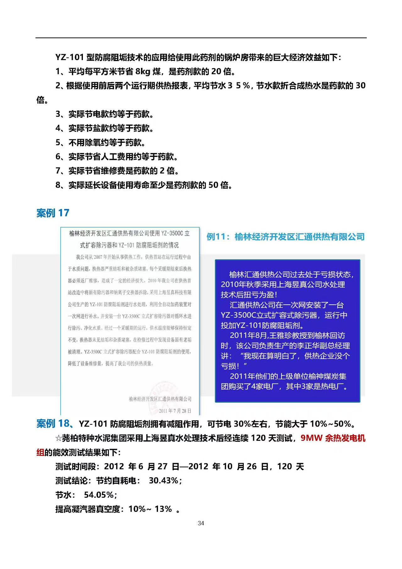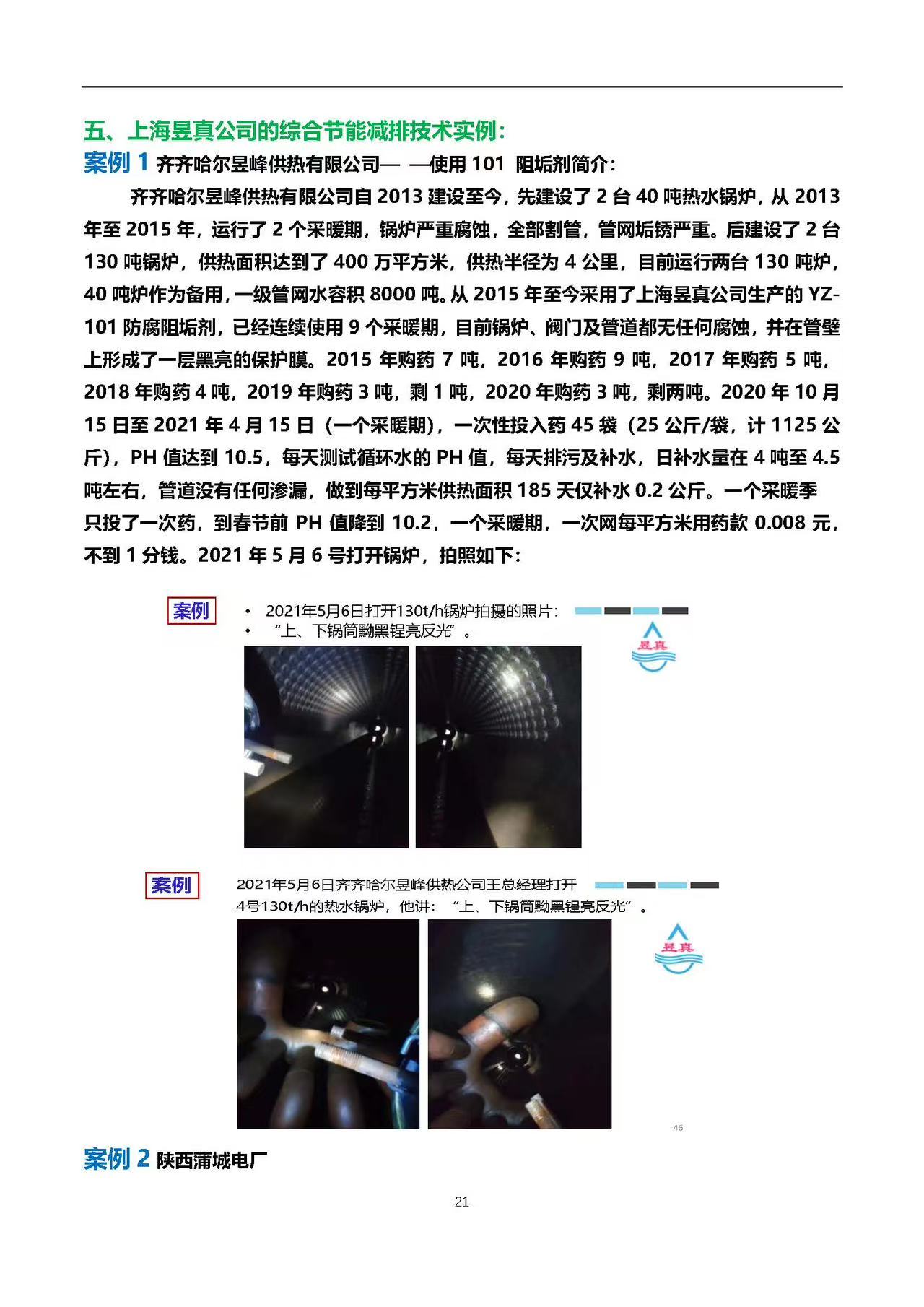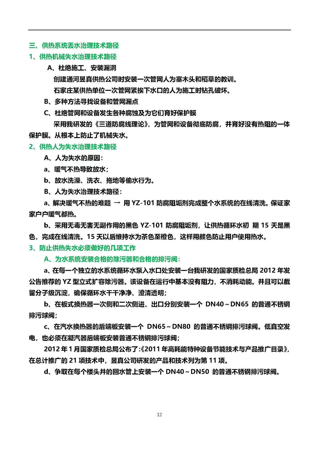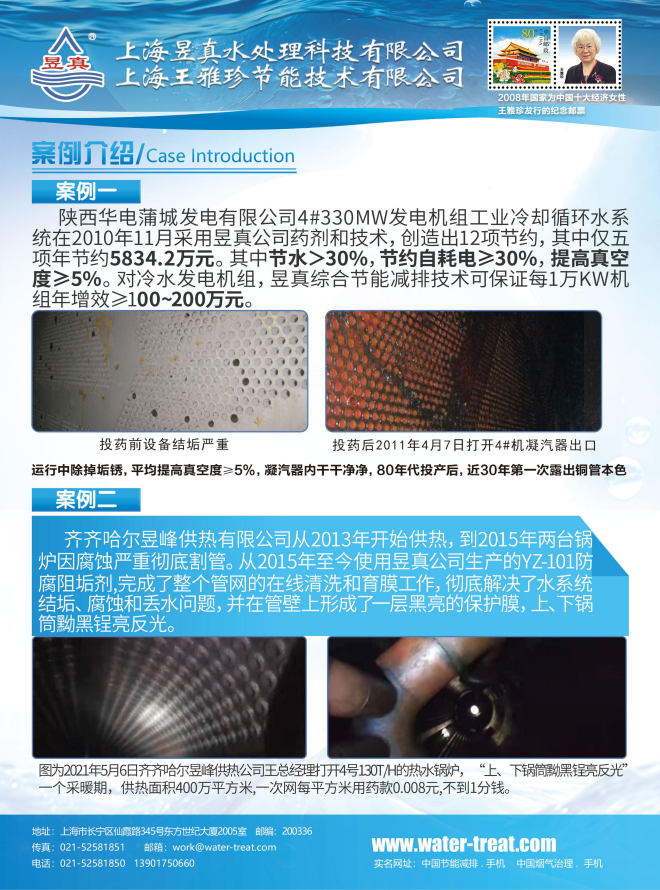 我的节能减排产品从1989年发明至今,在全国有400家左右供热企业使用,六十几家工业冷却循环水用户使用。在密闭水系统领域,以供热企业为例,采用我的综合节能减排技术,一定可以节约燃料30%至70%、节水50%至99%(仅剩排污水)、节电≥30%,把事故率降到最低,设备和管网使用寿命延长三到五倍。在敞开式工业冷却循环水领域,以拥有凝汽器的电厂为例,一台30万千瓦发电机组,就可以提高凝汽器的真空度3%至10%、节水30%至70%、节约自耗电约30%,凝汽器和辅机设备再也不用清洗,保证一台30万千瓦机组年增效3千至5千万元,保证一台100万千瓦发电机组年增效1.5至两个亿!用一周时间完成设备减阻排污改造,投药一个月完成在线清洗,运行第二个月就可以把全年的设备改造和药剂费用挣回来!即运行两个月就可以收回全年的成本!