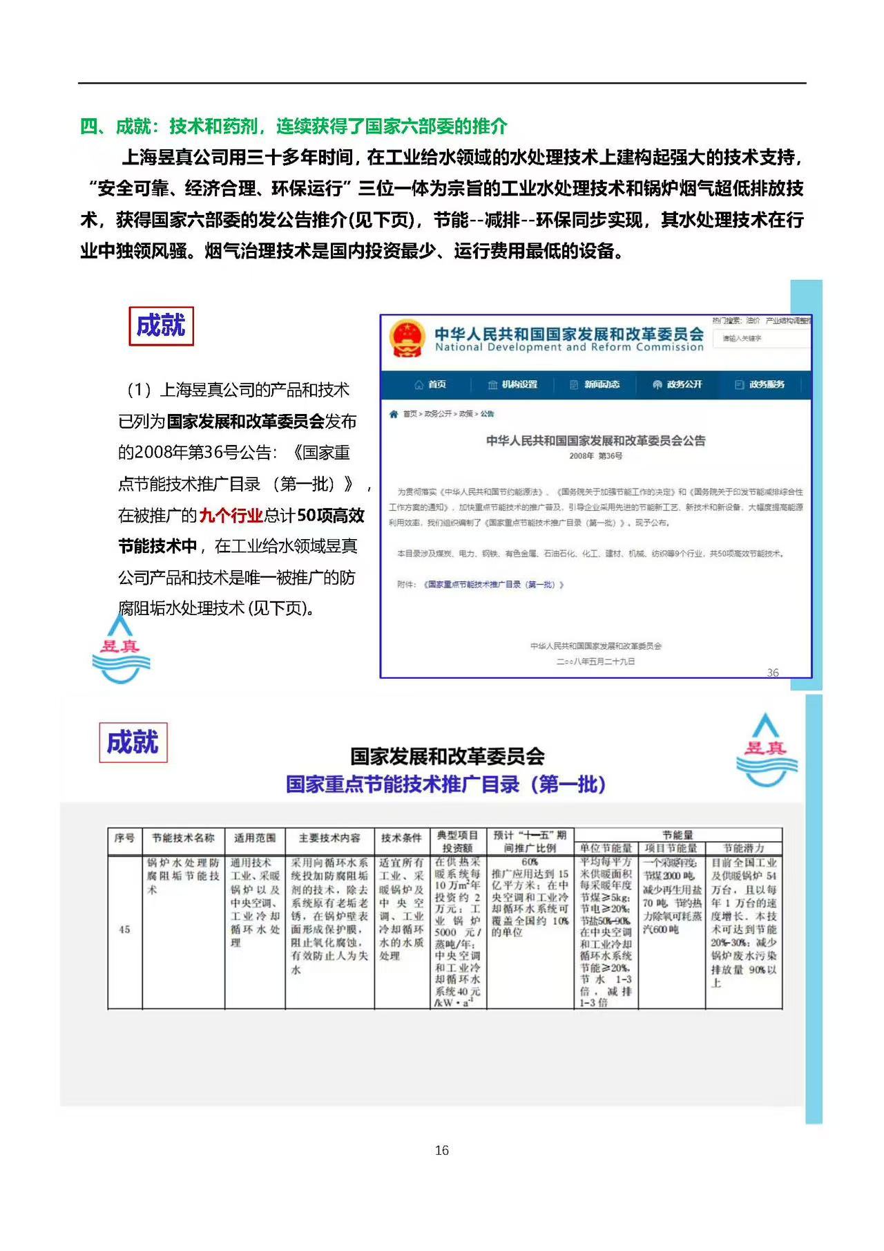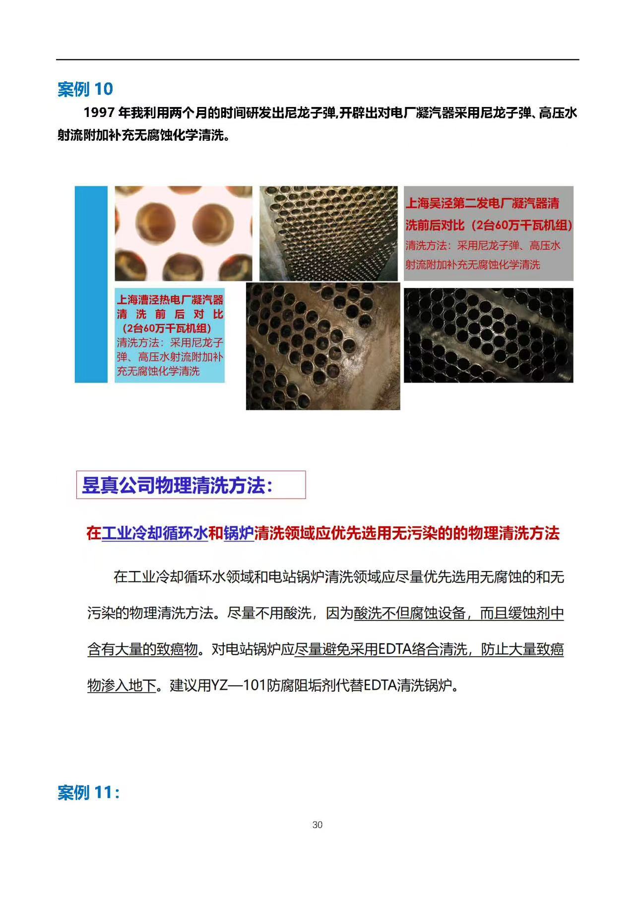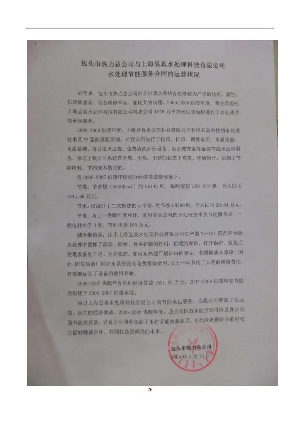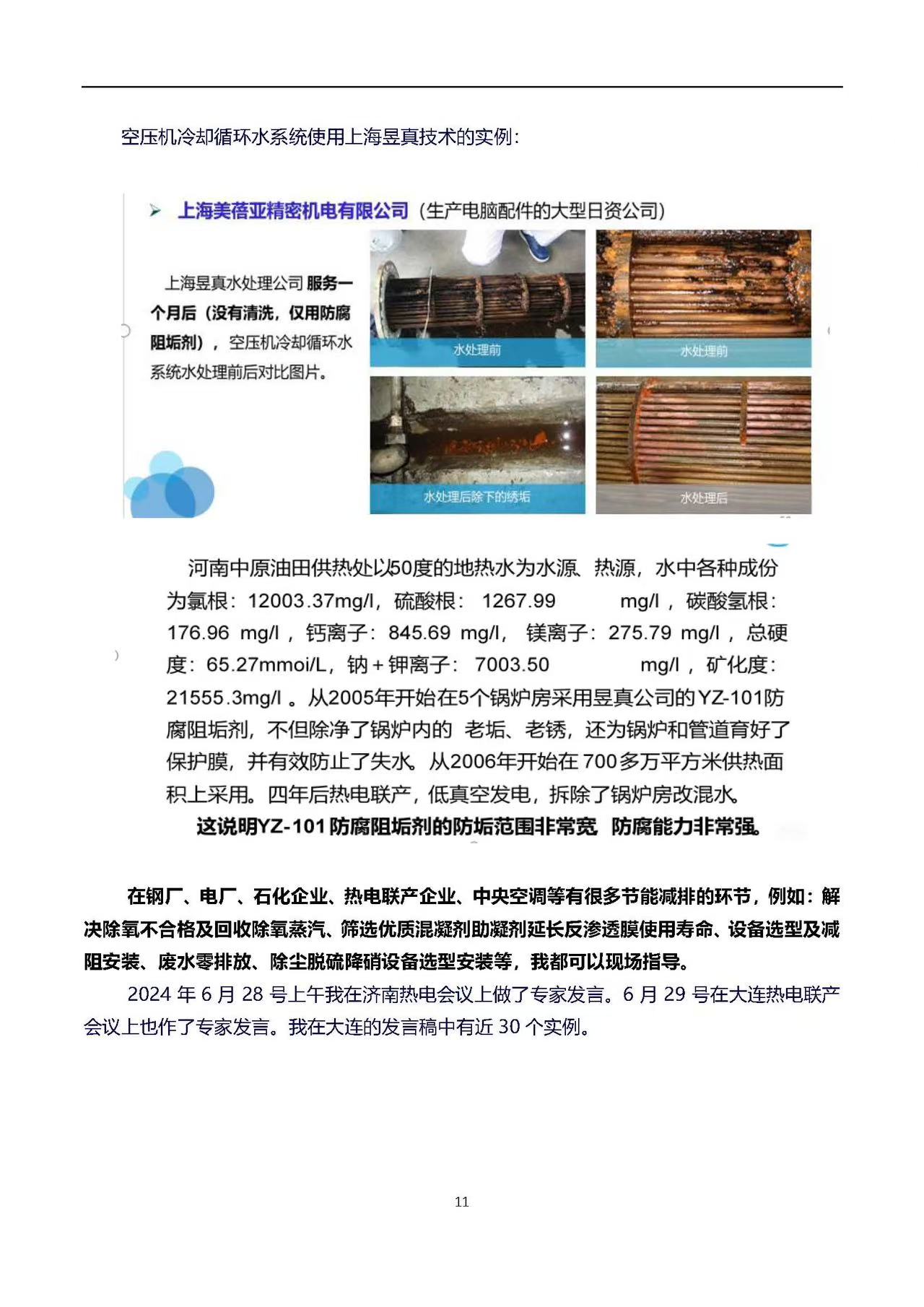我的节能减排产品从1989年发明至今,在全国有400家左右供热企业使用,六十几家工业冷却循环水用户使用。在密闭水系统领域,以供热企业为例,采用我的综合节能减排技术,一定可以节约燃料30%至70%、节水50%至99%(仅剩排污水)、节电≥30%,把事故率降到最低,设备和管网使用寿命延长三到五倍。在敞开式工业冷却循环水领域,以拥有凝汽器的电厂为例,一台30万千瓦发电机组,就可以提高凝汽器的真空度3%至10%、节水30%至70%、节约自耗电约30%,凝汽器和辅机设备再也不用清洗,保证一台30万千瓦机组年增效3千至5千万元,保证一台100万千瓦发电机组年增效1.5至两个亿!用一周时间完成设备减阻排污改造,投药一个月完成在线清洗,运行第二个月就可以把全年的设备改造和药剂费用挣回来!即运行两个月就可以收回全年的成本!