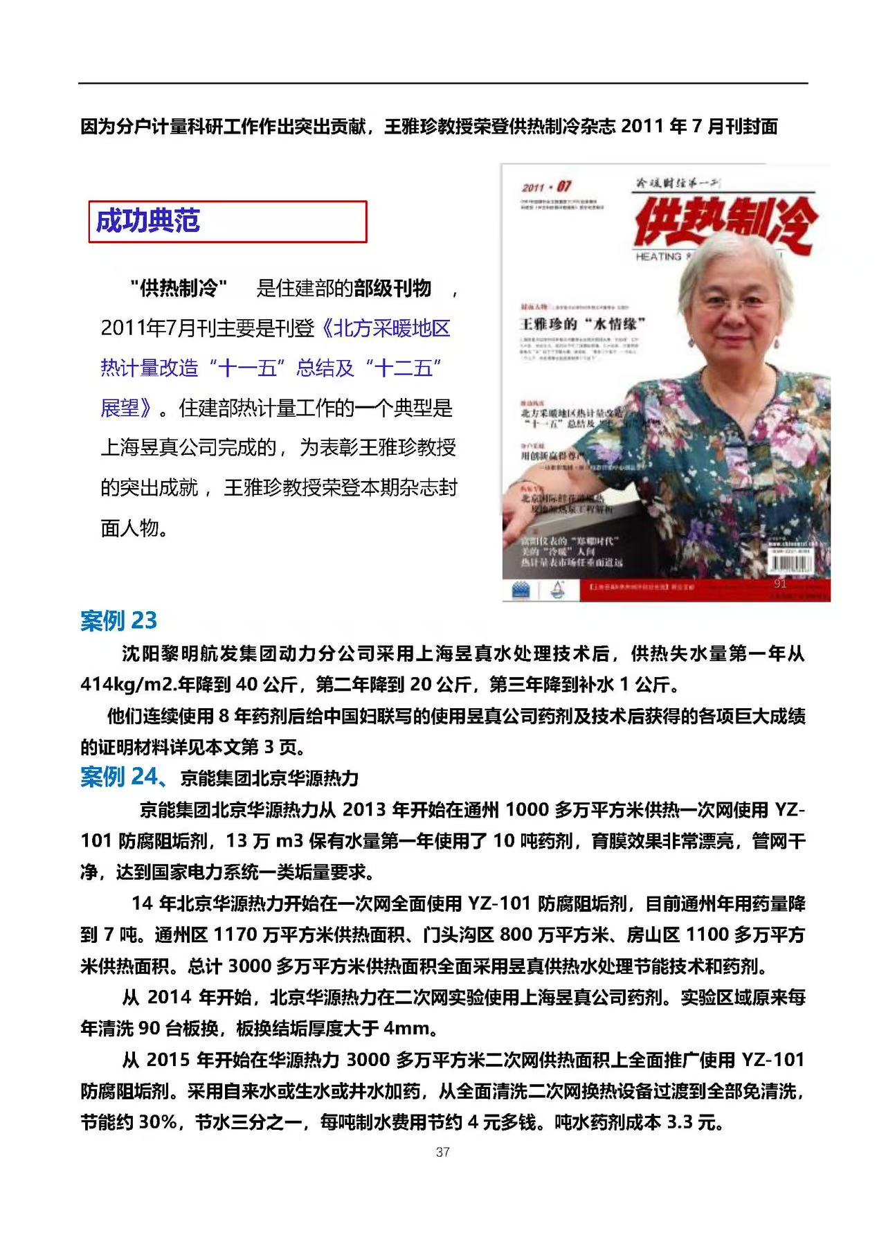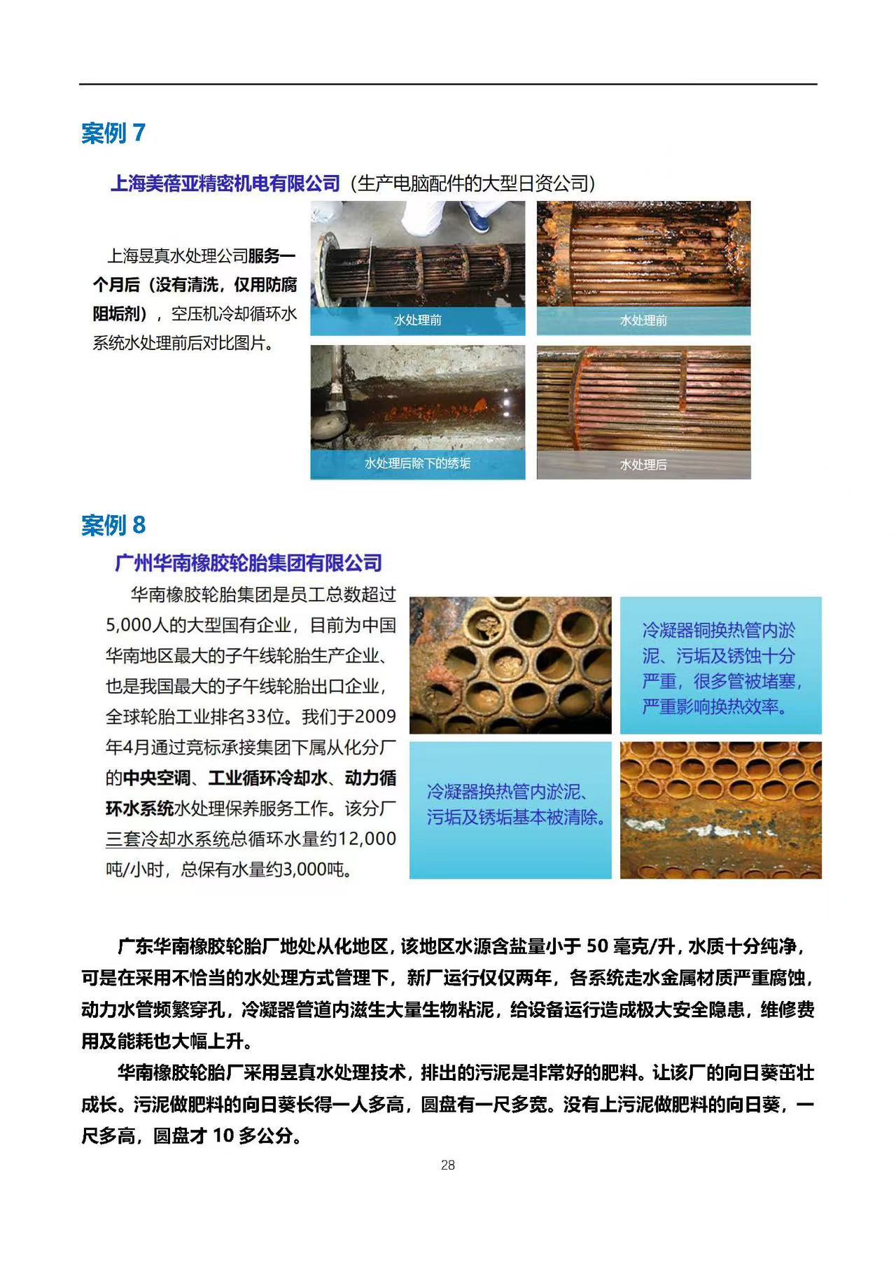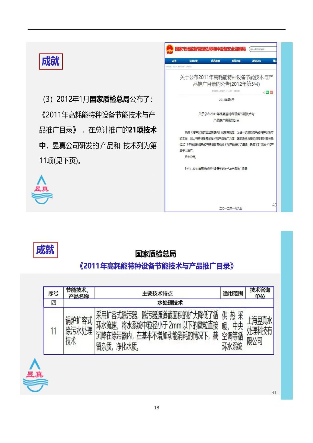 我的节能减排产品从1989年发明至今,在全国有400家左右供热企业使用,六十几家工业冷却循环水用户使用。在密闭水系统领域,以供热企业为例,采用我的综合节能减排技术,一定可以节约燃料30%至70%、节水50%至99%(仅剩排污水)、节电≥30%,把事故率降到最低,设备和管网使用寿命延长三到五倍。在敞开式工业冷却循环水领域,以拥有凝汽器的电厂为例,一台30万千瓦发电机组,就可以提高凝汽器的真空度3%至10%、节水30%至70%、节约自耗电约30%,凝汽器和辅机设备再也不用清洗,保证一台30万千瓦机组年增效3千至5千万元,保证一台100万千瓦发电机组年增效1.5至两个亿!用一周时间完成设备减阻排污改造,投药一个月完成在线清洗,运行第二个月就可以把全年的设备改造和药剂费用挣回来!即运行两个月就可以收回全年的成本!