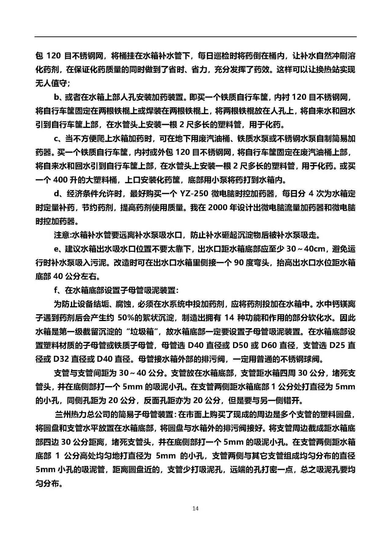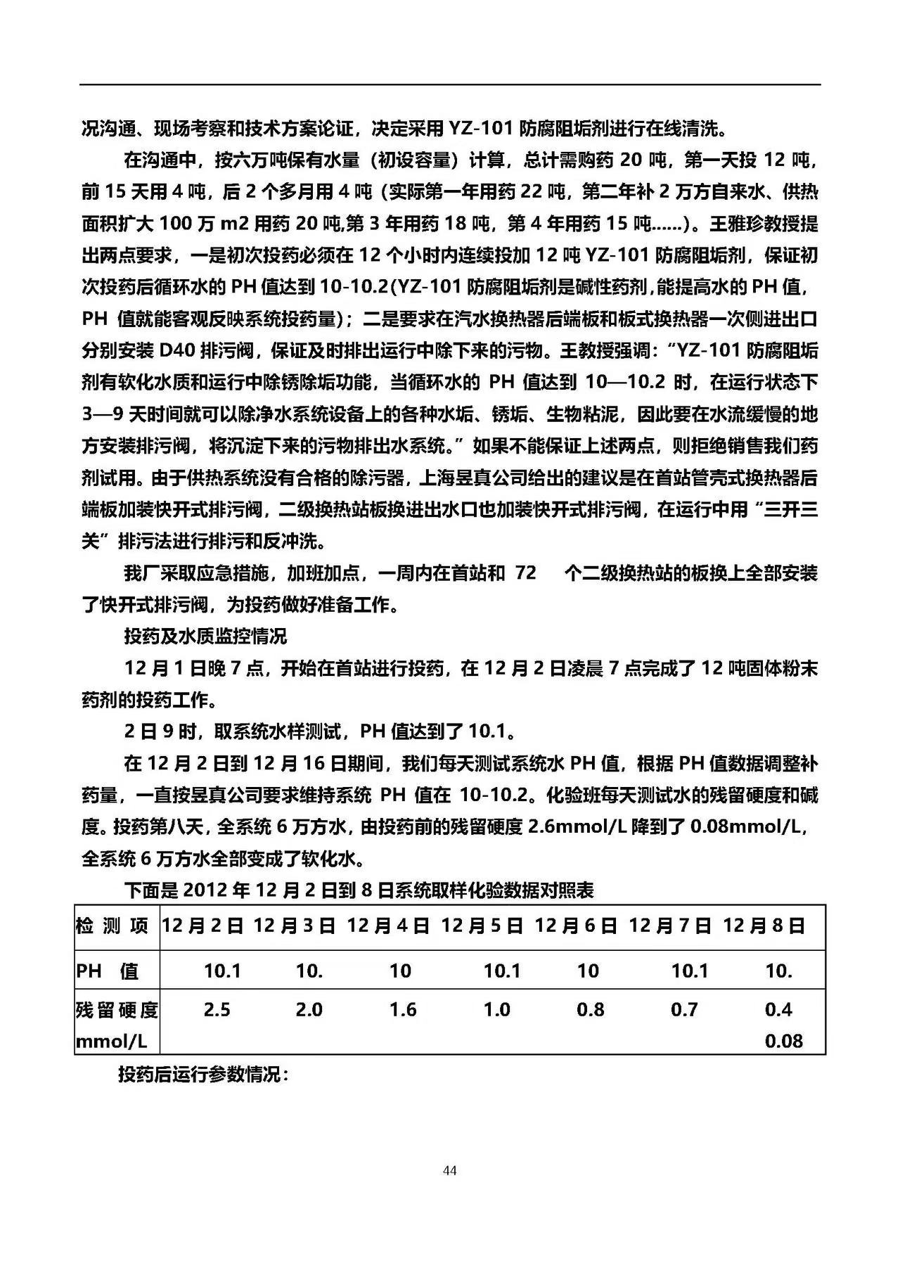 热水锅炉运行中是以CO2和垢下腐蚀为主,因此不应该采用钠离子交换,应该采用碱性药剂去除原水中的硬度,利用碱度做不花钱的沉淀剂及在运行中完成在线清洗。我的三道防腐线理论摘录到了北京市地标DBJ01-619-2004《供热采暖系统水质及防腐技术规程》中。地标中给我的“三道防腐线”加了定语:“使用固体防腐阻垢剂后一般不再除氧就能有效地防腐,它有以下三种功能:1)由于除垢除锈,就等于除掉了电化学腐蚀的阴极,从而阻止了电化学腐蚀; 2)含有几种育膜剂,在铁的表面生成一层黑亮的保护膜,可阻隔氧和二氧化碳的腐蚀;3)它是碱性药剂,能迅速提高水的pH值。当pH值≥10时,铁处于钝化区中,腐蚀最小”。最后又下了结论:“实践证明,使用固体防腐阻垢剂是一种简单而行之有效的水处理方法”。