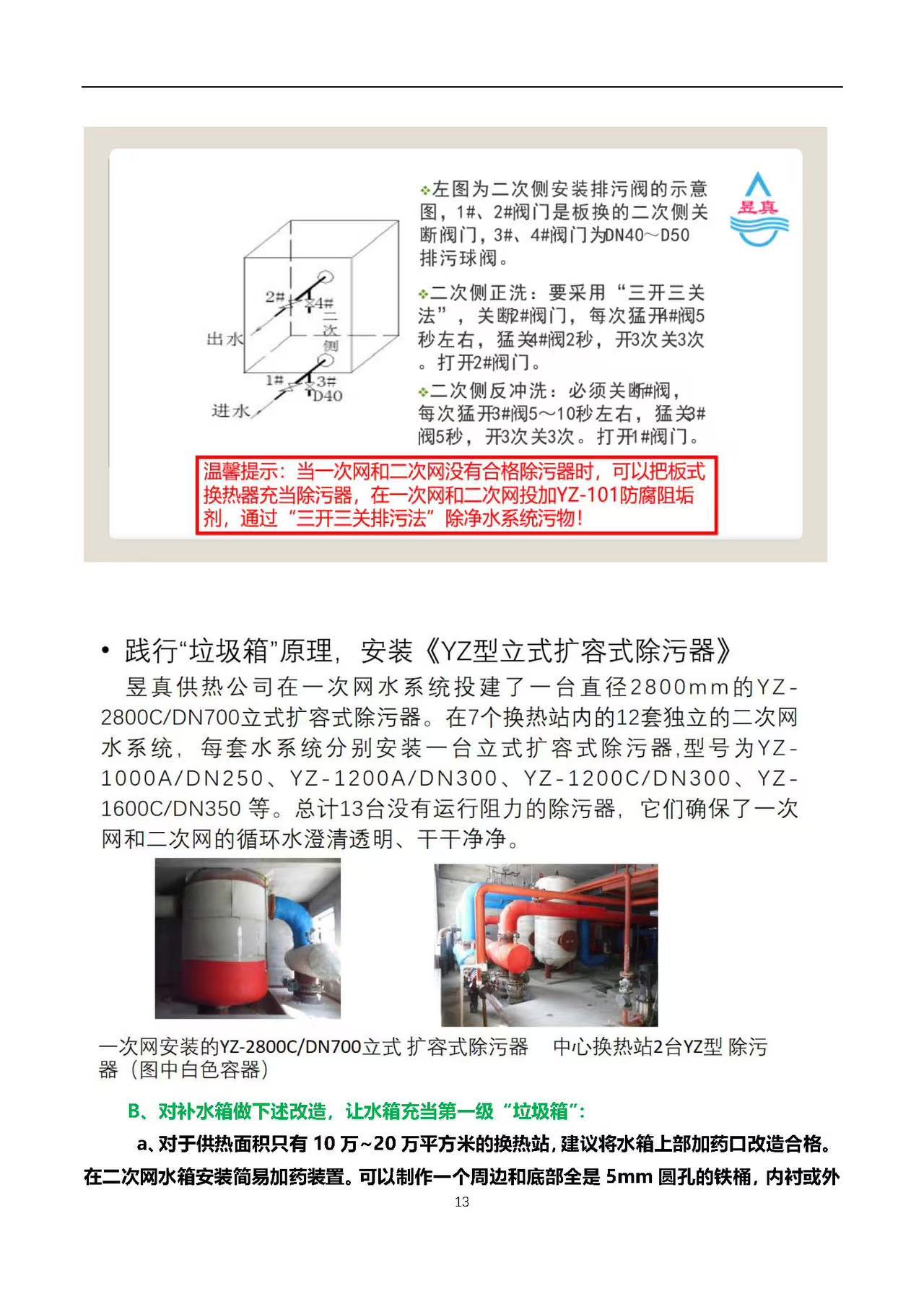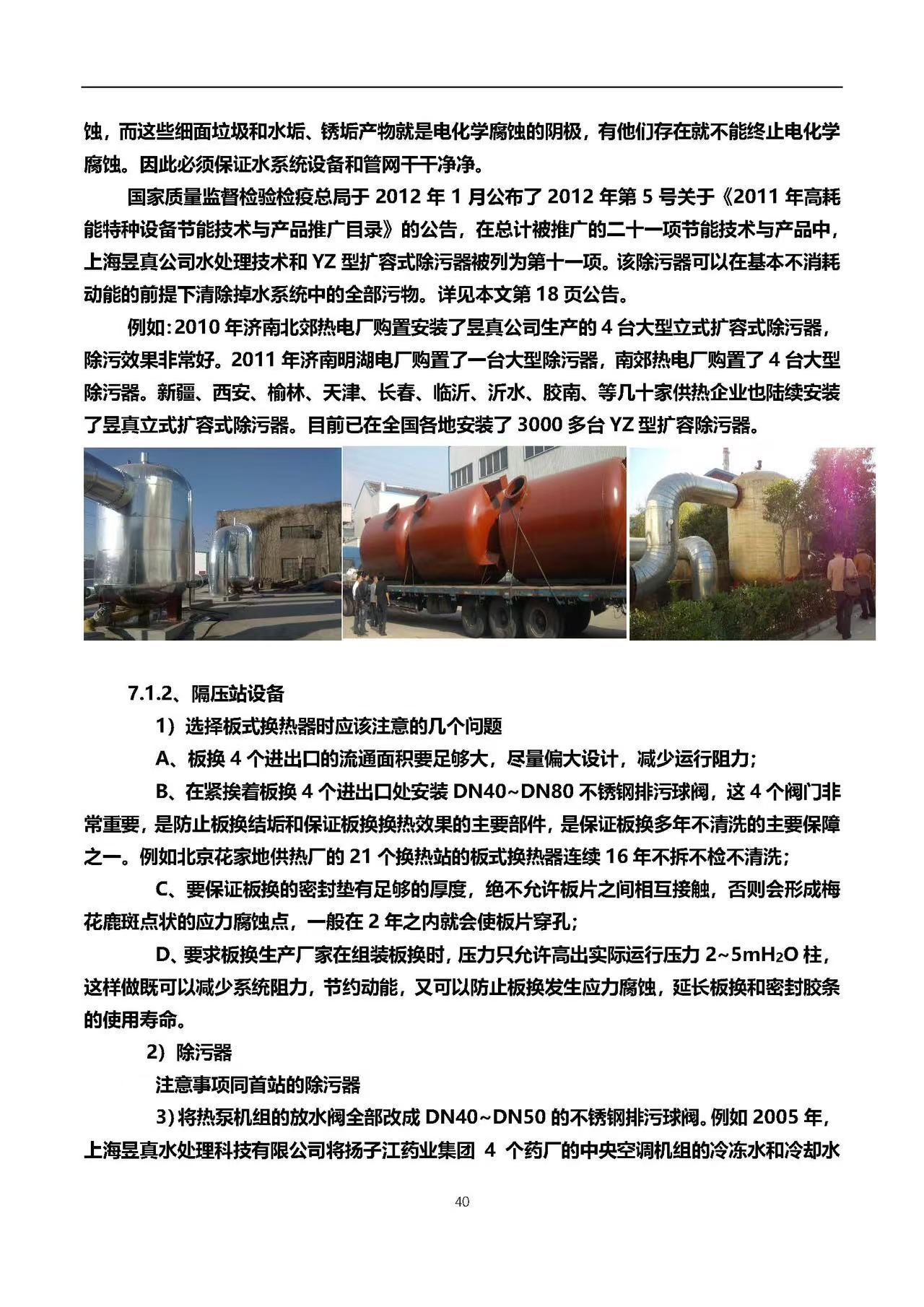 c、对在冷却塔内闭式循环的水系统,要在换热设备的适当位置安装排污球阀。在进循环水泵前安装YZ型扩容除污器。王雅珍教授设计的除污器基本不消耗动能,进出口压力相同,而且可以沉淀分子级的沉淀物。该产品是2012年国家质检总局在5号公告中推荐的节能技术和产品;