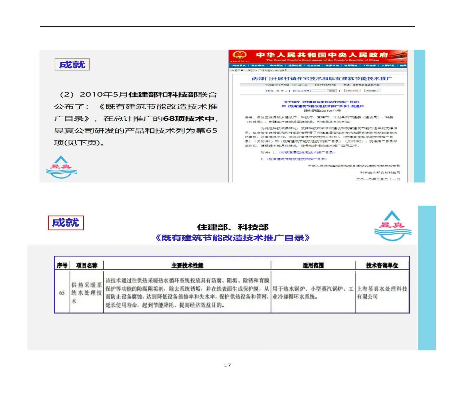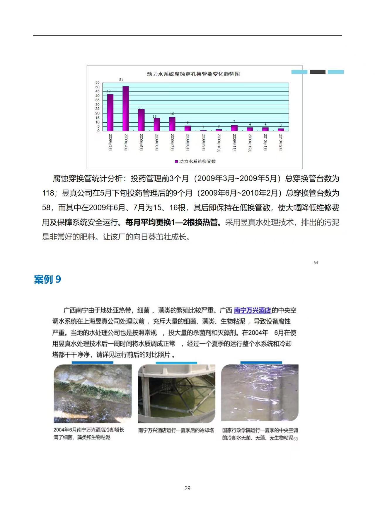 采用昱真综合节能减排技术,在供热采暖领域可以节约燃料20%~50%(最多节约70%)、节水50%~99%、节电≥30%;在敞开式工业冷却循环水系统和中央空调水系统可以做到节约燃料≥10%、节水30%~70%、节约自耗电≥30%,以一台100万千瓦冷水发电机组为例,一年可以增效大于1.5~2亿元。在节能减排的前提下,大幅度降低设备事故率,延长设备使用寿命3~5倍。
