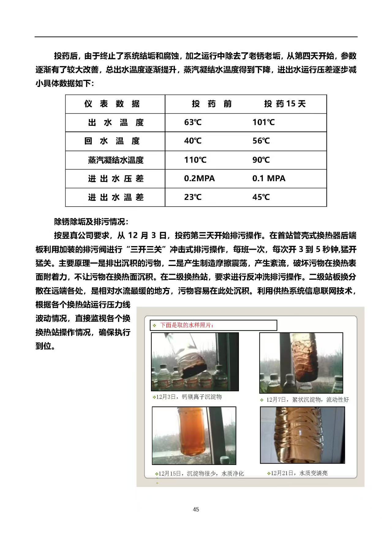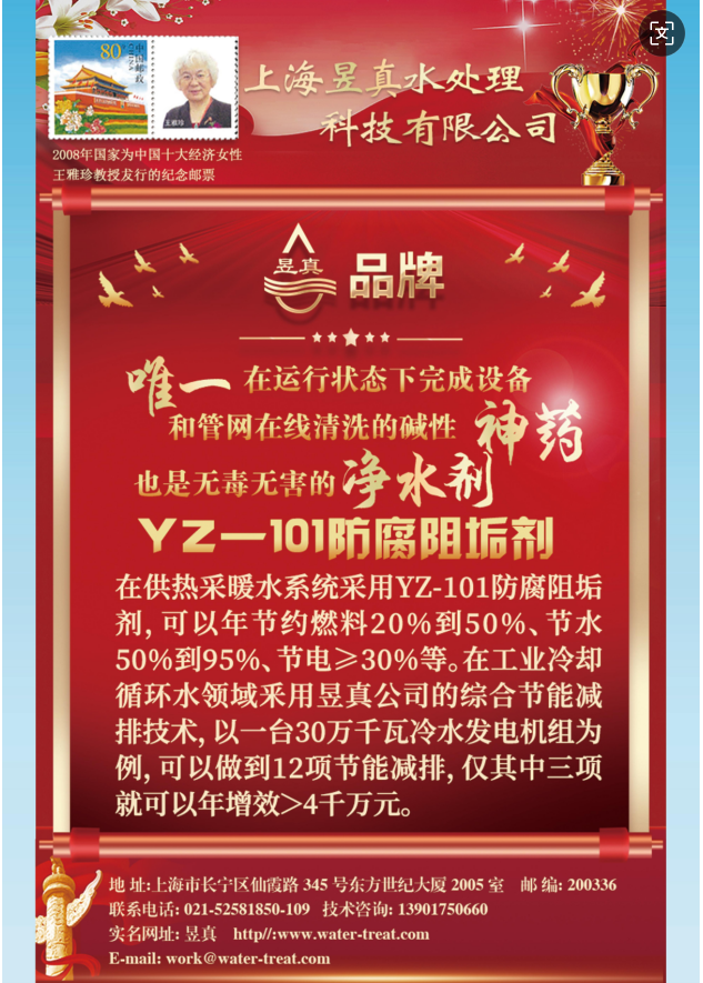 ⑶ YZ-101防腐阻垢剂除掉了整个水系统中的垢、锈,使水系统的运行阻力减少,水力平衡得到改善,整个管网恢复到运行初期的水平,故也显着节能,一般节能幅度在5%~15%。