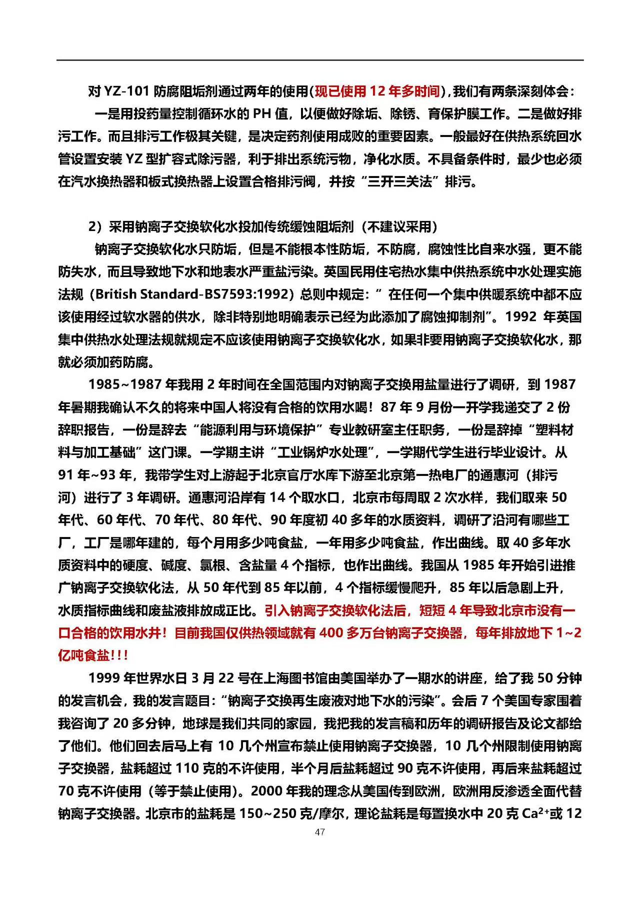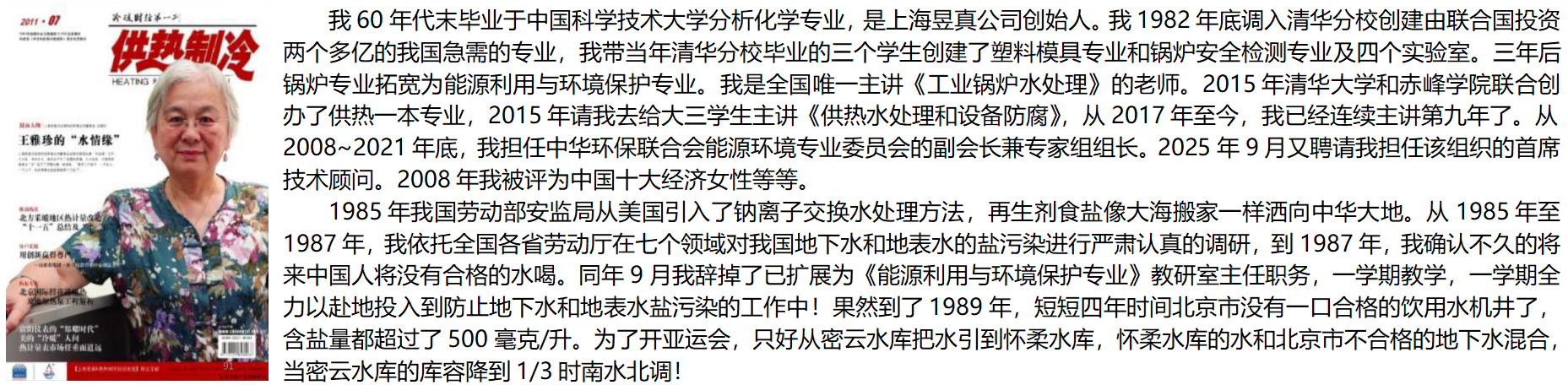 我从1987年开始大力宣传取消钠离子交换至今!1999年3月22日世界水日美国在上海图书馆举办了一期水的讲座,我作为专家50分钟的发言题目是《钠离子交换再生废液对地下水的污染》,会后七个美国专家围着我问了20多分钟,我认为保护水是全人类的责任,所以把我十多年的调研资料和发言论文都给了他们,他们回去后半个月内十几个州宣布禁止使用钠离子交换器,十几个州限制使用钠离子交换器。2000年我的理念从美国传到欧洲,欧洲全面禁止使用钠离子交换器,他们都用反渗透设备代替钠离子交换器。但是,在中国至今仍在强推钠离子交换器,仅供热领域就有400多万台钠离子交换器,仅在供热领域每年就有一到两亿吨食盐被排放到中华大地!导致人类饮用高钠水患高血压心脏病及诱发癌症!