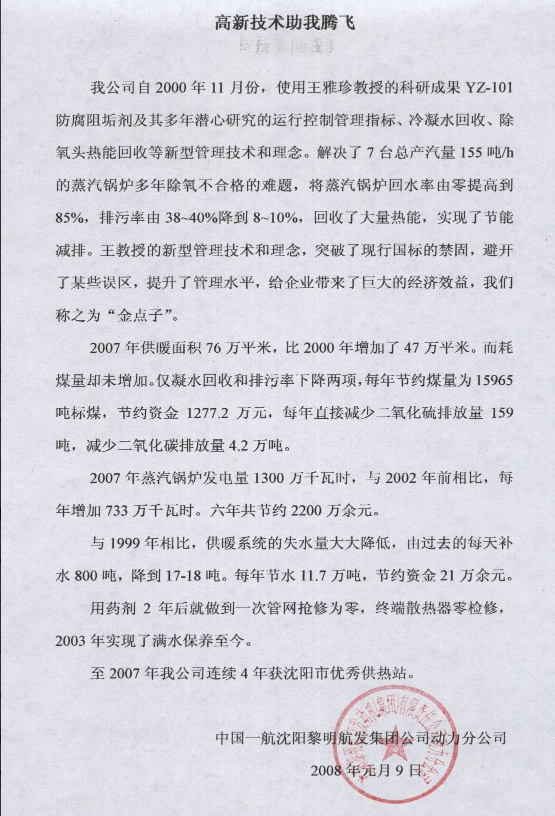 a、以沈阳黎明航发集团为例(生产军用飞机发动机的军工企业)。2000年,王雅珍教授到沈阳开全国供热会议。利用晚上两个半小时到该厂发电车间进行现场诊断和指导。该厂拥有7台10公斤低压发电锅炉,7台锅炉全开发的电还不够自己用,还得外买电。经过王教授两个半小时的现场指导,按照王教授的指导进行了适当的设备改造。结果生产任务翻一番,开三台发电锅炉就不用外买电了。创造了一系列节能减排的巨大成绩。详见他们给昱真公司的感谢信。