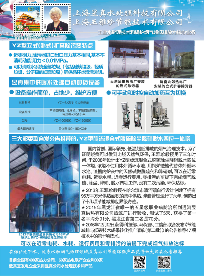 2005年我国提出了要煤改气,当时我国煤占比能源消耗的80%(目前煤的消耗占比不到70%),我认为首先要解决的是煤的清洁燃烧和燃煤锅炉烟气的清洁排放。因此,我在2005~2008年设计了YZ型旋流混合式脱硫、除尘、降硝、脱水四位一体塔。为了验证该塔的使用效果。2013年我在黑龙江清河林业局(在哈尔滨市清河镇)灭掉了6个烟尘肆虐的小锅炉房,自己设计、投资、创建了一个95万m2供暖面积的集中供暖,应用我自主研发的十几项科研技术创建“碧水蓝天美丽城镇”,取得了一系列节能减排亮点:我亲自管理运行六年,创造了十多项节能减排国内外第一的奇迹。