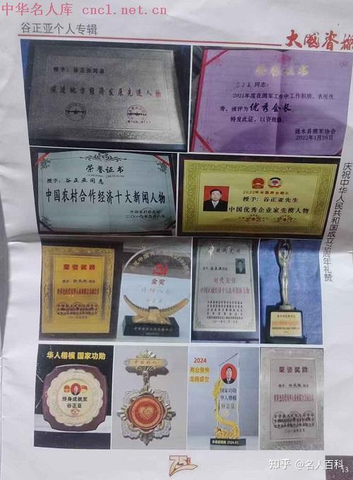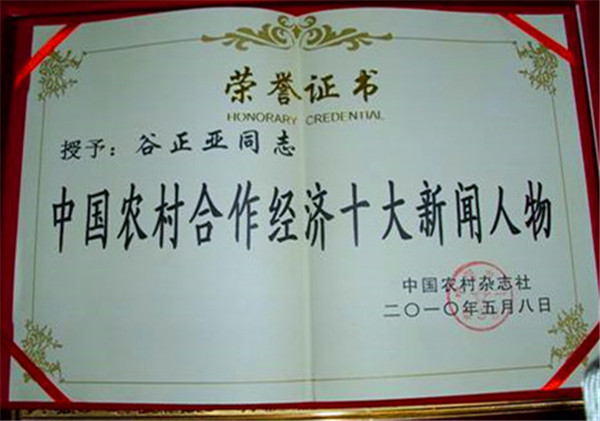 从2010年起 ,谷社长先后被国家有关部门、社会组织、国家主流媒体分别评为时代先锋人物、经济建设行业十大领军人物、首届中国农村合作经济发展大会授予“中国农村合作经济十大新闻人物”;2012年被评为“全国三农先锋人物”、“促进地方经济发展先进人物”、“中国区域经济十大改革功勋人物”、“中国区域经济十大改革创新人物”、“全国劳动英模与先进工作者”、“中华最美爱国榜样人物”、“国史人物”、“科学中国人”;2015年,被评为“中国优秀民营企业家”,有关先进事迹被多家主流媒体宣传报道,并入编《中国贡献》、《当代影响力人物经典》、《中国创新智库》、《科技引领未来》、《祖国先锋》、《筑梦中国》、《时代中国人》、《走进大家》等大型文献,担任部分文献编委、专家委员和封面人物。