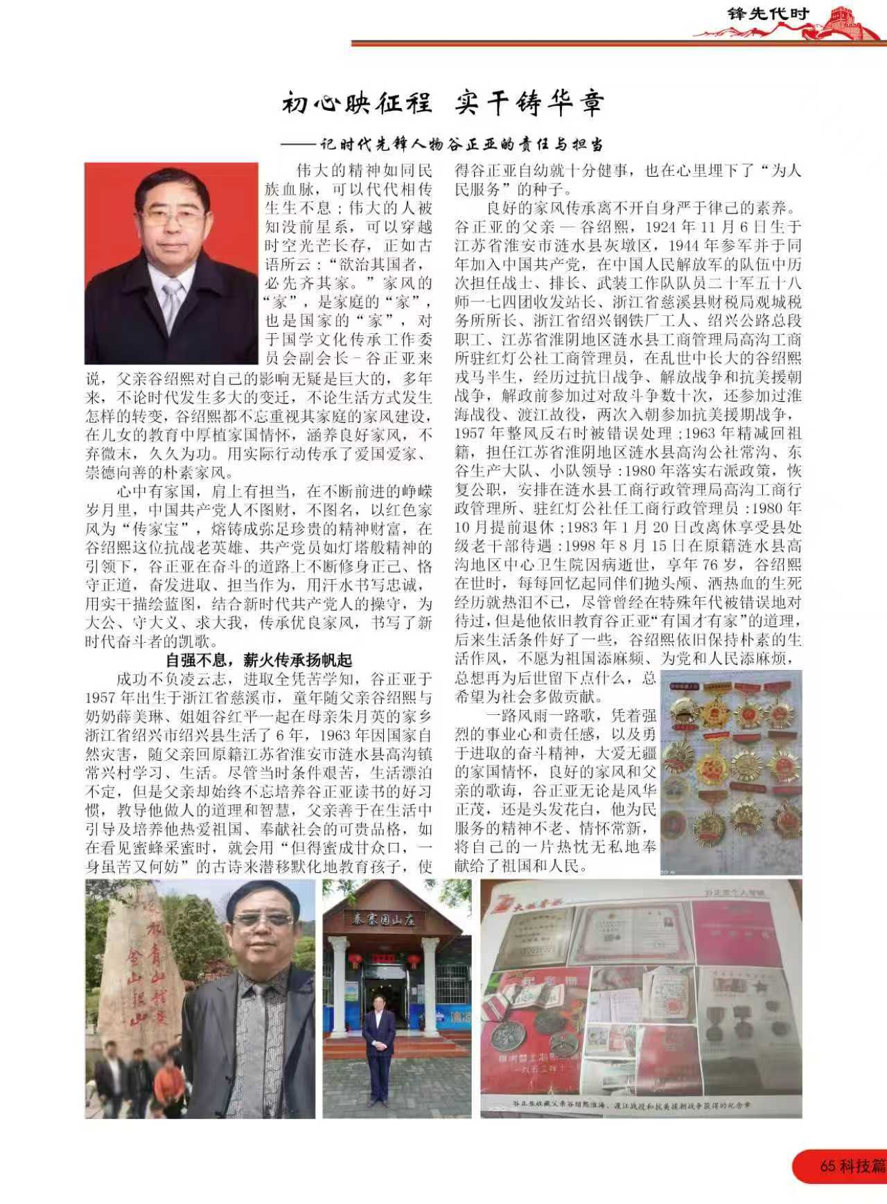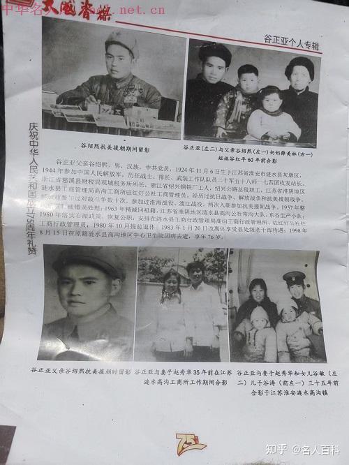 父亲谷绍熙44年参军入党,参加过抗日战争、解放战争、两次入朝抗美是二十军五十八师一七四团军邮站长。他与自愿军首位特级战斗英雄杨根思和水门桥战斗英雄连是一个师的战友,我父参加过淮海、渡江等战役,在抗美援朝战争中被美国细菌武器打伤和严重冻伤后回国治愈二次入朝参战,是抗美援朝五次战役英雄部队的一员。受过金日成将军颁发银质军功章奖励,回国后担任浙江省慈溪县财税局观城税务所所长期间在整风反右运动中被错误处理(后落实政策)在哪特殊年代被红卫兵抄家批斗,但他一直对党忠诚、热爱祖国在不同岗位上努力工作,从来没有一点负面言论,一位在历次运动中履遇不公对待的抗日老兵,如此坚定的爱党爱国值得宣传!