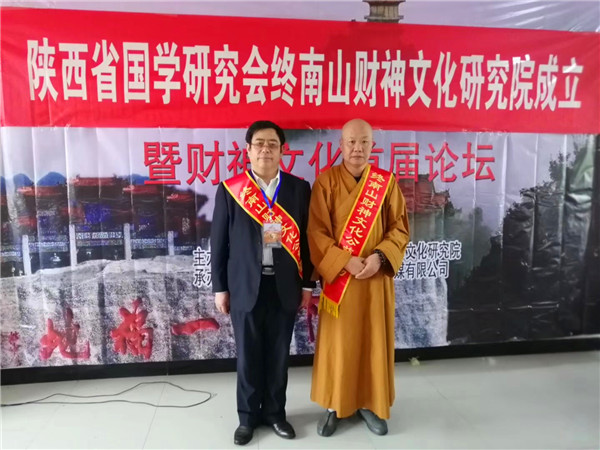 2019年4月27日中国科技创新人物网副总编辑兼江苏执行总编辑谷正亚,西安出席终南山财神文化论坛,在终南山财神文化研究院成立大会上与联合国华人文化产业联合会释弘音禅师合影